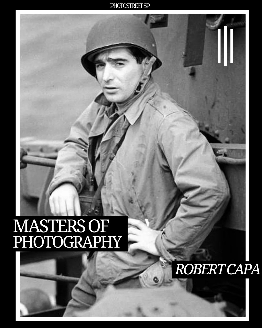 Robert Capa (1913-1954) foi um fotógrafo documental e fotojornalista húngaro, conhecido por seu trabalho de fotografia de guerra. Uma de suas mais célebres frases é: “Se suas fotografias não estão boas o suficiente, então, você não estava perto o suficiente.” O estilo único de Capa permitiu que capturasse momentos históricos de forma singular, o seu trabalho é ainda hoje de extrema relevância.